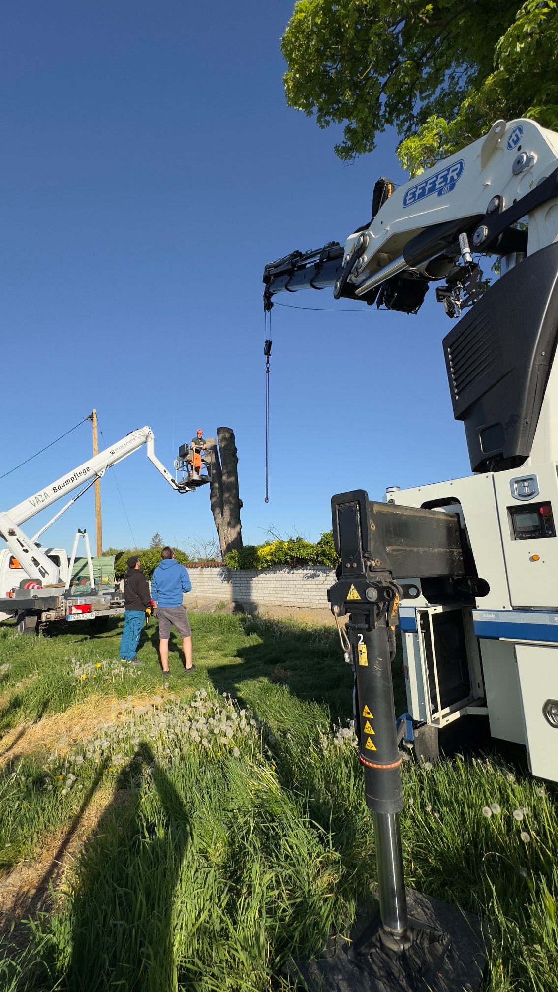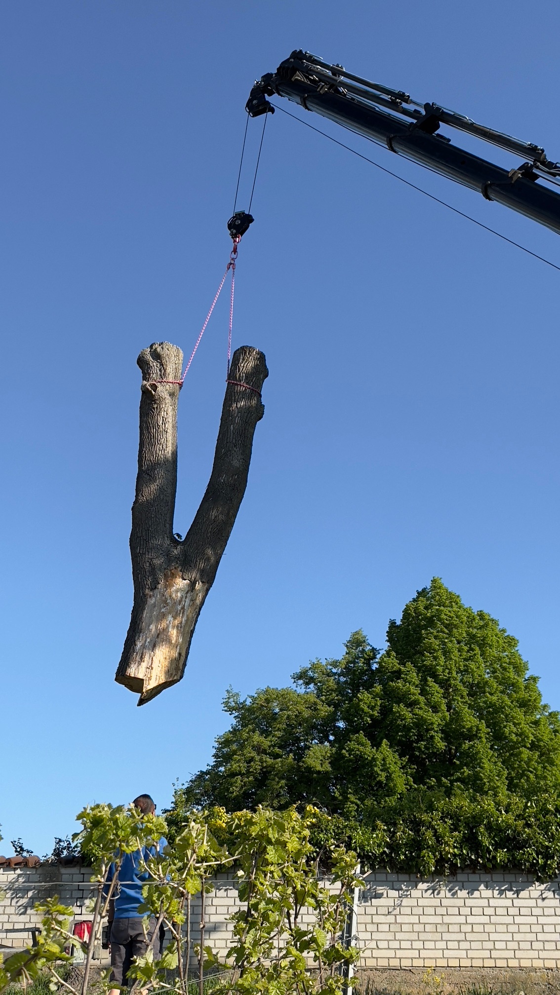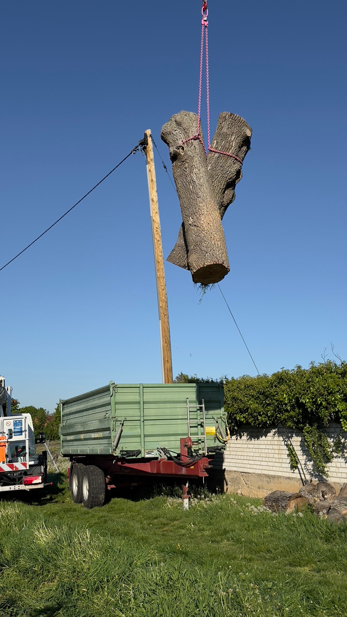 Heute wurde der Baumstumpf am Friedhof gefällt. Auch die Reste kommen jetzt nach und nach weg. Nachdem es lang genug trocken war, konnte der Kran bis an den Baum ranfahren. So konnte die Fällung endlich durchgeführt werden.