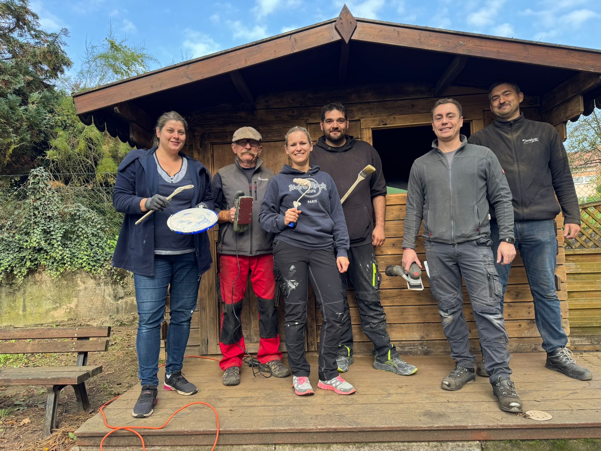 Heute hat ein Teil der Eltern der Kindergartenkinder die beiden Lagerhäuschen am Eingang unserer Kindertagesstätte neu angestrichen. Das Holzhaus wurde erst abgeschliffen, dabei stellten wir fest, dass es schade wäre das Holz mit dunkler Farbe zu streichen. Kurzerhand wurde farblose Lasur gekauft um die Holzstruktur sichtbar zu lassen. Zudem war es jetzt deutlich heller. Gleiches gilt für das Massivhäuschen, das mit einer Cremefarbe gestrichen wurde, als Vorbereitung für den nächsten Schritt. Dazu aber erst mehr, wenn er umgesetzt ist. Vielen Dank für die Einsatzbereitschaft und der Hilfe beim Geldsparen. Habe ihr toll gemacht.