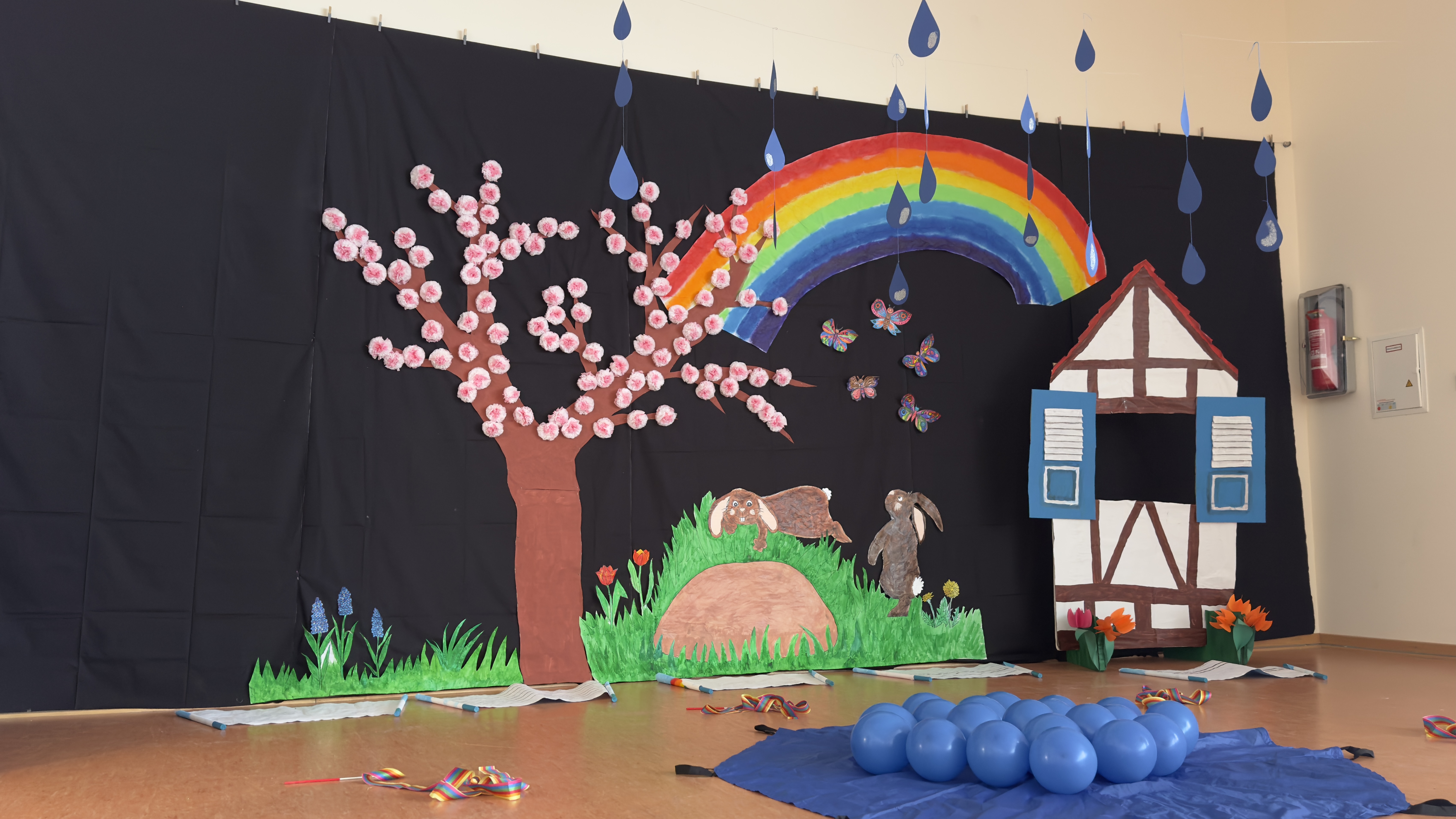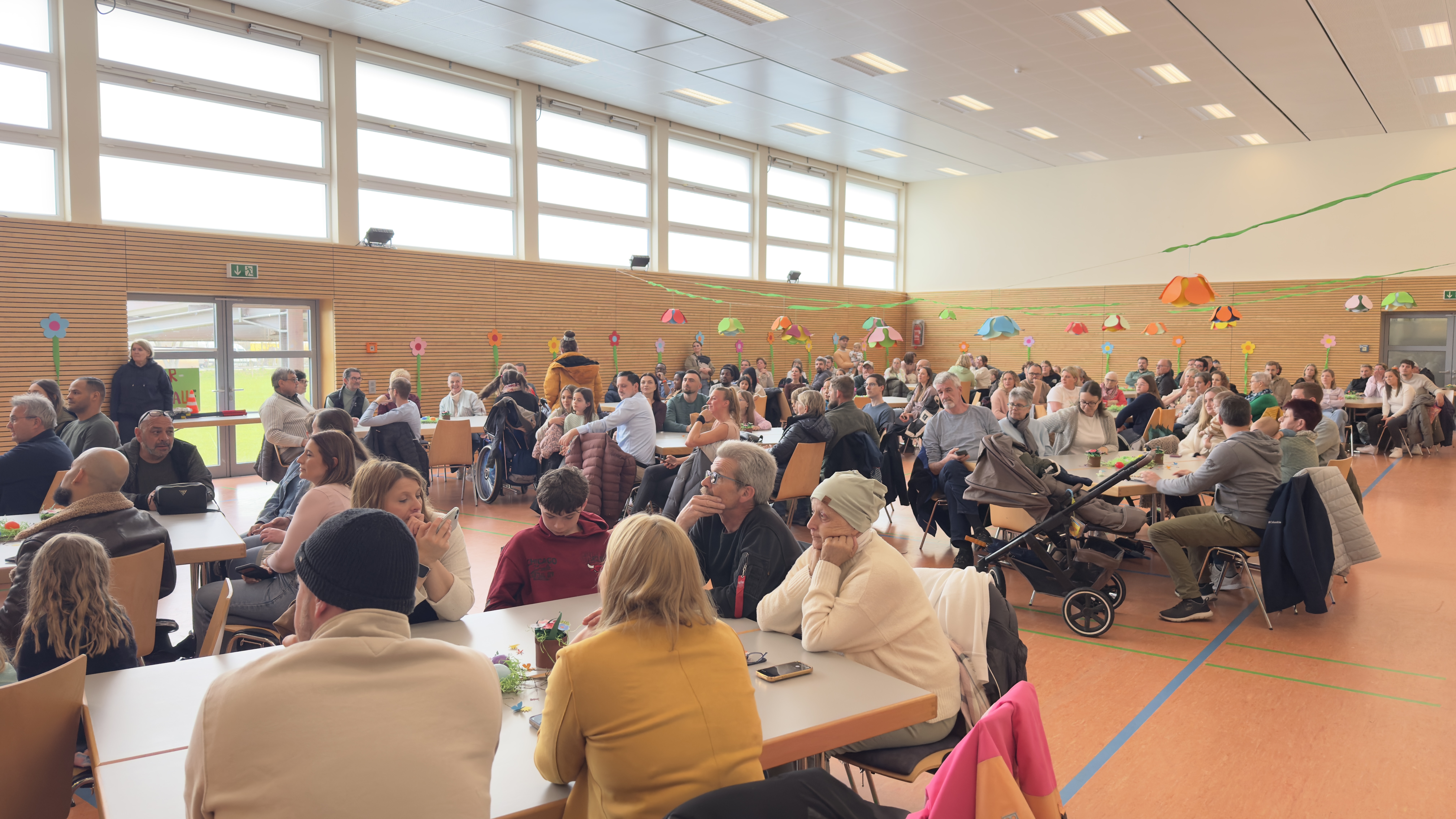 Am letzten Samstag haben unsere Kindergartenkinder ihr Frühlingsfest in der Dorfgemeinschaftshalle gefeiert. Die Erzieherinnen haben in mühevoller Kleinarbeit eine tolle Kulisse auf der Bühne geschaffen und die Halle mit Papierblumen geschmückt. Rund 150 Eltern, Omas, Opas, Onkel und Tanten haben dann gespannt auf die Aufführungen der Kinder gewartet. Es war toll anzusehen was die Kinder vorführen konnten und zu was sie in der Lage sind. Auf jeden Fall hatten alle eine Menge Spaß. Nach den Aufführungen und vor den Kreativstationen wurde noch das reichhaltige Kuchenbuffet geräubert.