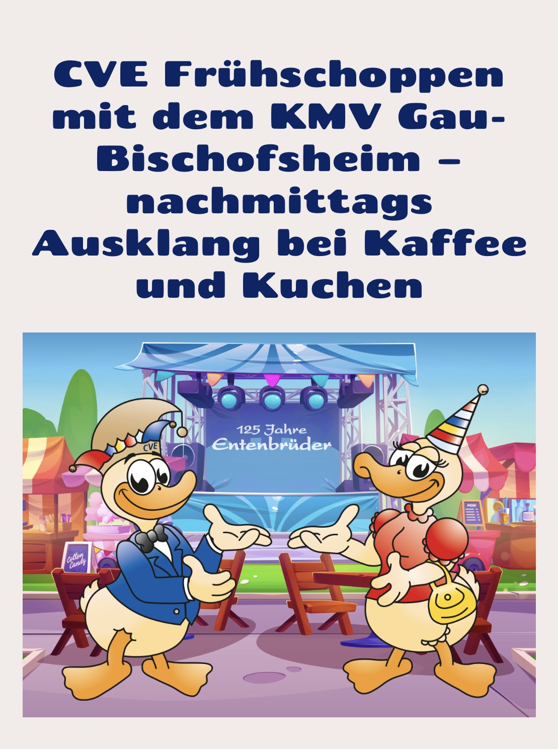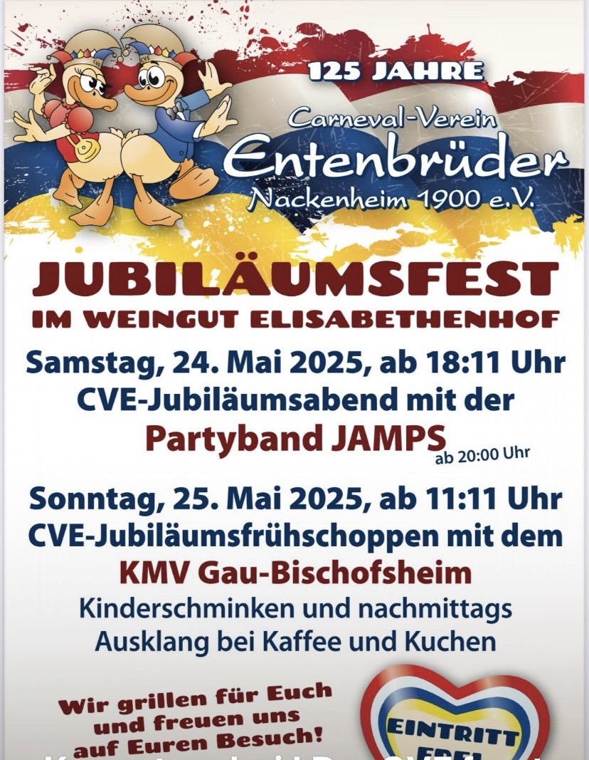 Am Sonntag, den 25.05.25 spielen wir ab 11:30 Uhr zum Jubiläum "125 Jahre Entenbrüder" im Weingut Elisabethenhof in Nackenheim.